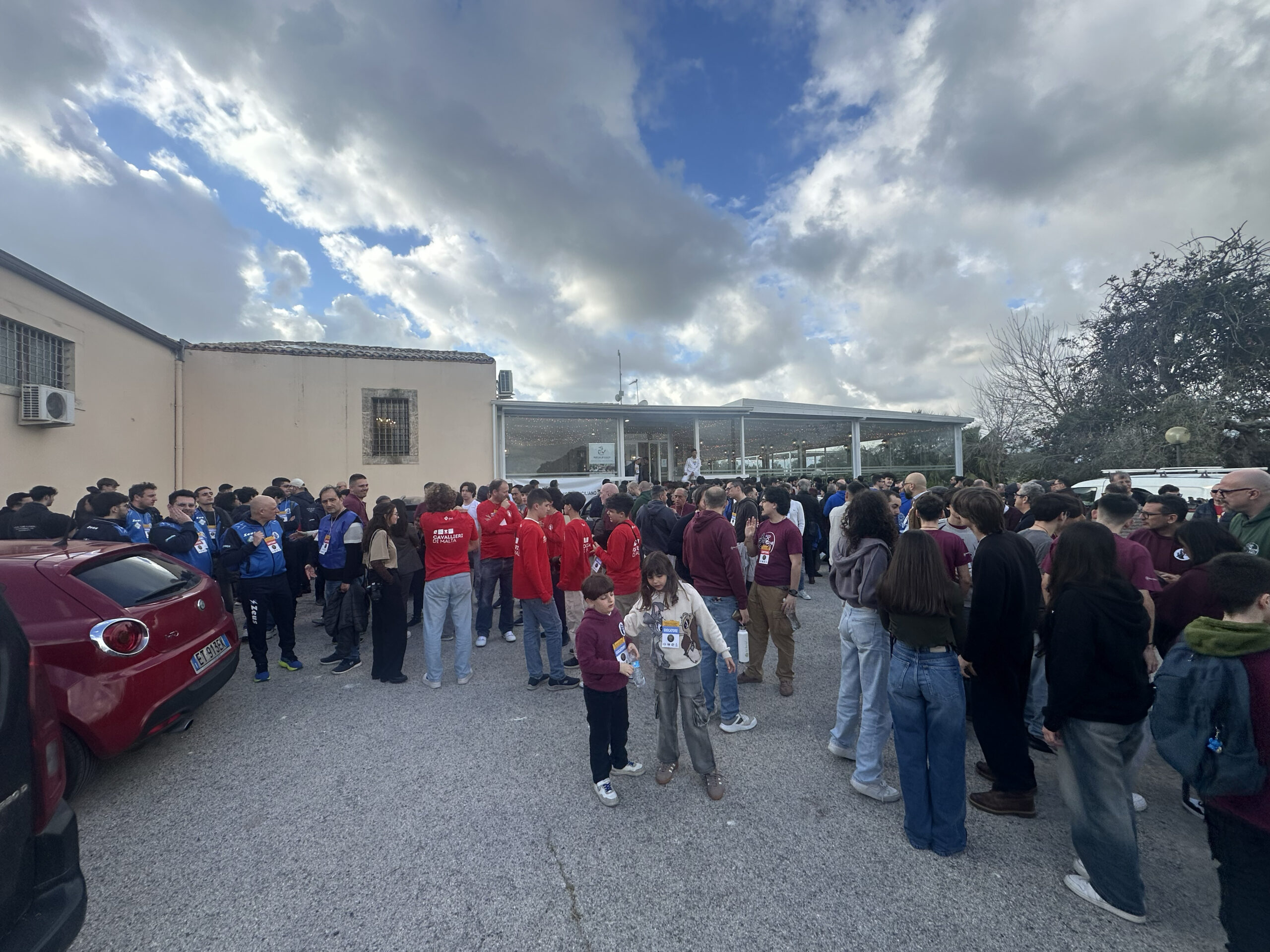 Players gather outside the playing hall in Ragusa, Sicily, ahead of the start of a round at